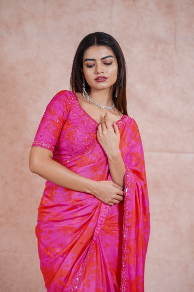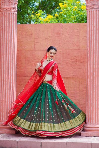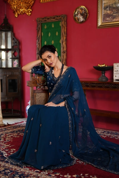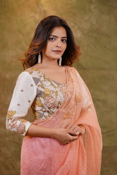 Enhance your wardrobe with our Bottle Green Raw Silk Blouse, a stunning embodiment of elegance and artistry. Crafted from luxurious raw silk, this blouse offers a rich texture and an opulent sheen that exudes sophistication. The blouse is adorned with exquisite floral Zardosi embroidery, meticulously handcrafted to create intricate patterns that showcase traditional Indian craftsmanship. The delicate floral motifs, embellished with shimmering Zari threads, add a touch of regal charm, making this piece a true work of art. Complementing the floral embroidery are the all-over buttas, adding a layer of elegance and refinement to the blouse. These small, intricately designed motifs create a harmonious balance, ensuring that every detail of the blouse is a testament to fine craftsmanship.